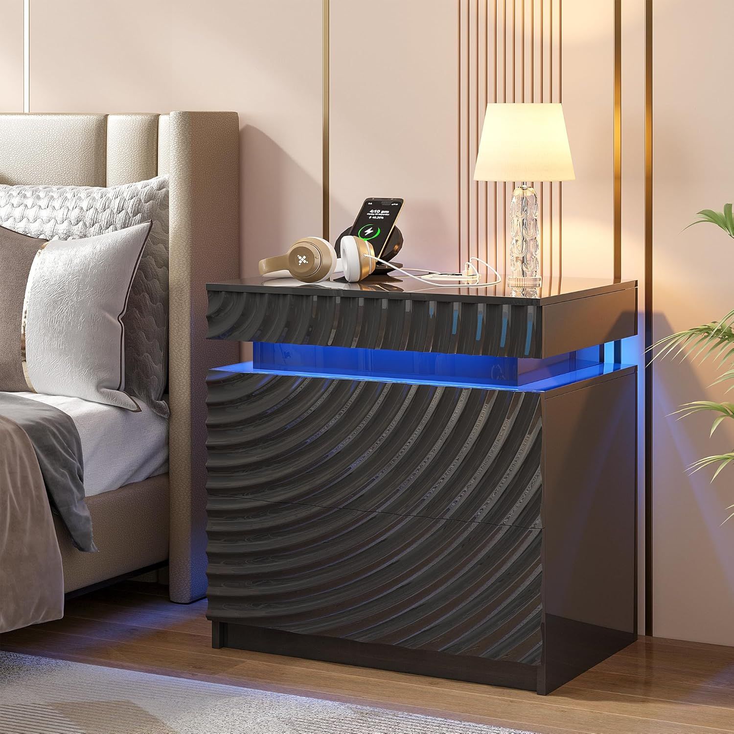Black Bedside Table with Charging Port, LED Lights & Motion Sensor, 3-Drawer Nightstand for Bedroom