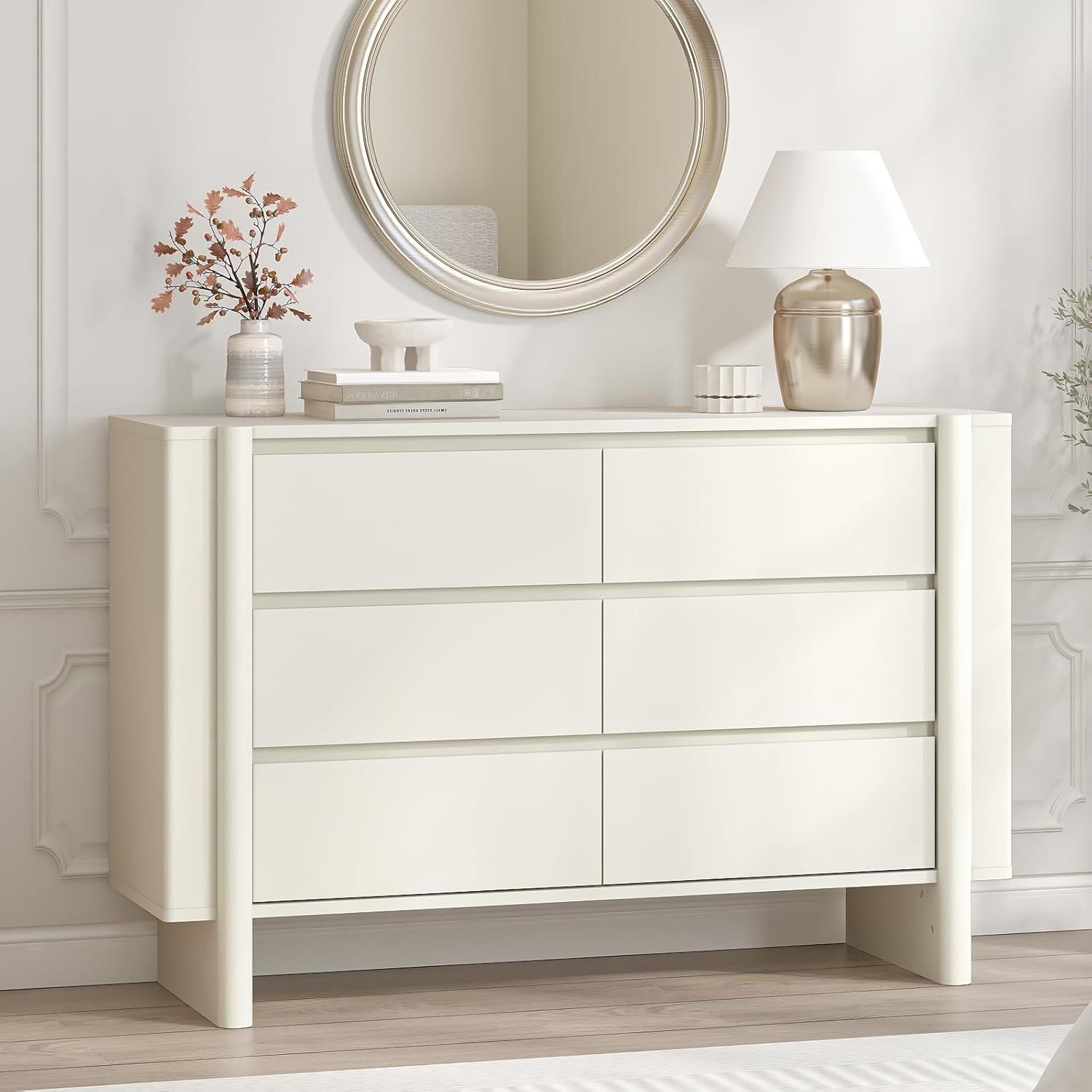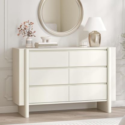 Mid-Century Modern Curved 6-Drawer Chest, 130 CM Wide, Antique White Dresser for Bedroom or Living Room